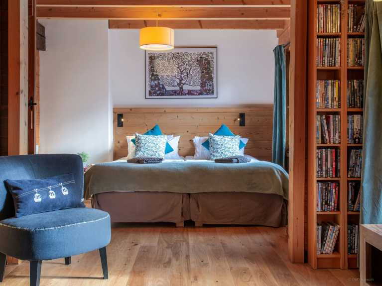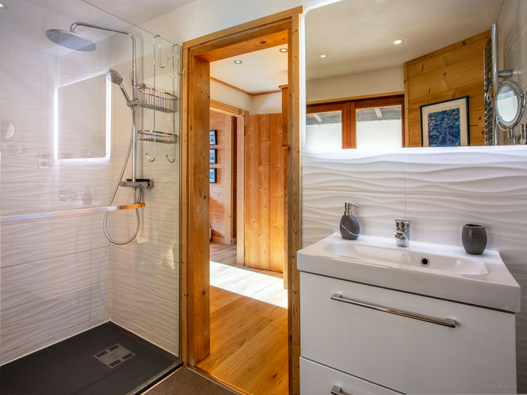 Lo chalet offre 4 camere da letto supplementari al primo piano. La camera da letto principale ha il suo bagno con doccia, così come uno spogliatoio e una toilette separata. I due letti singoli possono essere uniti per formare un grande letto matrimoniale. Questa camera si apre su un balcone.