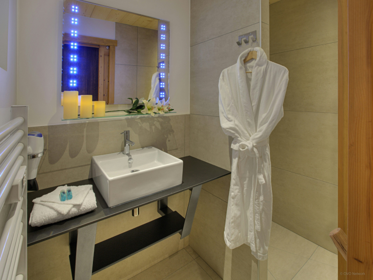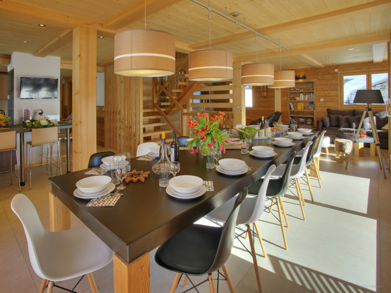 Le due aree lounge sono dotate di un bar, una pista da ballo e un comodo salotto vicino al camino. La cucina completamente attrezzata si apre sulla zona pranzo, che può accogliere tutti gli ospiti intorno al tavolo. Grandi finestre si aprono sulla terrazza. C'è anche un bagno con doccia su questo livello e una toilette separata su ogni piano. Il deposito sci dispone di un asciuga scarponi e di un deposito per la vostra attrezzatura. C'è una rimessa sicura per le biciclette con punti di ricarica per le biciclette elettriche.