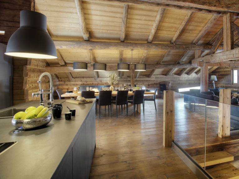 L'isola della cucina è completamente attrezzata. Potrete cucinare per tutti gli ospiti dello chalet e il grande tavolo vi permetterà di condividere i vostri pasti insieme. La zona cucina ha delle finestre a bovindo che conducono al balcone, dove si può godere della vista mentre si prende un aperitivo, per esempio.