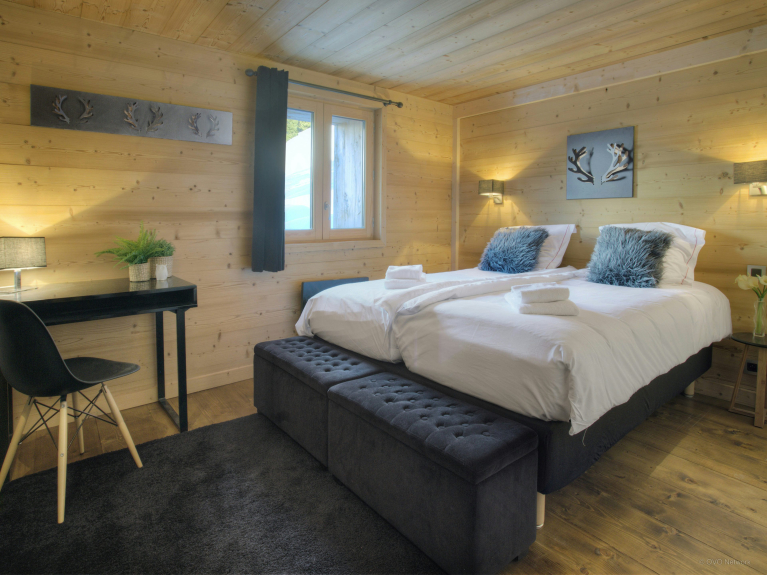 Le sei camere da letto altrettanto eleganti si trovano al piano terra dello Chalet Victorina. Due camere da letto doppie condividono un bagno con doccia, ma ognuna ha il proprio accesso. Ci sono altre due camere da letto con bagno (una matrimoniale, una doppia), un'altra camera matrimoniale e un'altra camera doppia. Questo livello ha anche un bagno con doccia e una toilette separata...