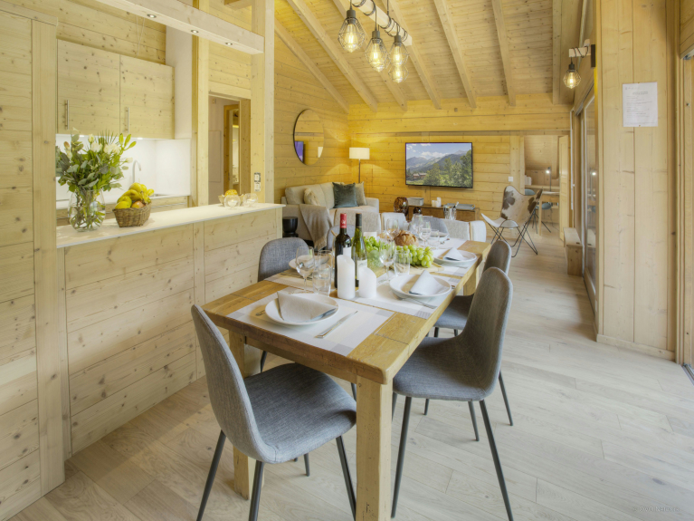 L'appartamento occupa un intero livello dello chalet, che ha altri quattro appartamenti. La zona giorno è completamente aperta ed è particolarmente spaziosa in quanto si estende per tutta la larghezza dell'appartamento e si apre su un balcone soleggiato esposto a sud. È un posto meraviglioso per rilassarsi, godersi il caffè del mattino o guardare il magnifico tramonto sul massiccio dell'Aravis sorseggiando un bicchiere di vino.