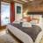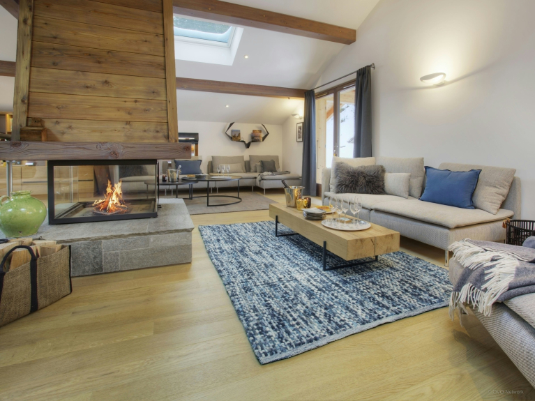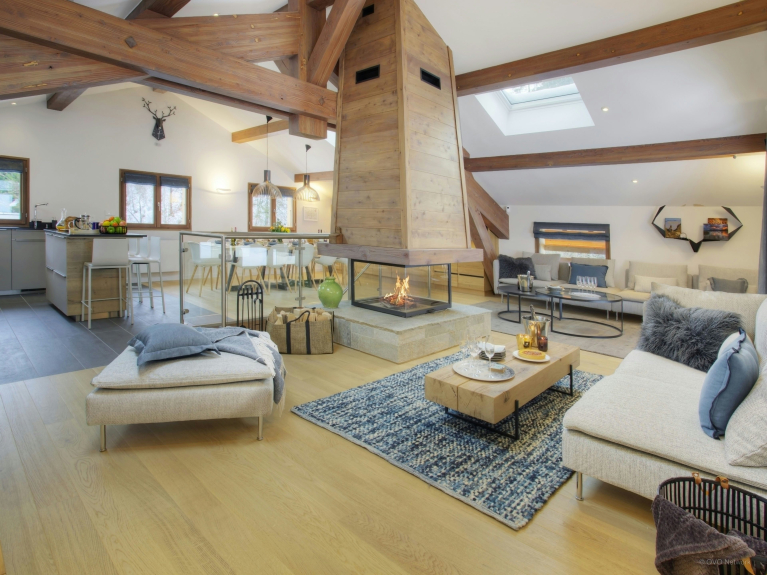 Poi vai al piano superiore al centro della zona giorno. Su un lato c'è la cucina completamente attrezzata con bar, grande tavolo e scaffali. Dall'altro, comodi divani, poltrone e tavolini sono disposti intorno a un camino centrale e alla TV. Vi piacerà stare in questa stanza per guardare un film, raccontare la vostra giornata o pianificare la vostra prossima avventura in montagna. Dei gradini portano alla terrazza e al giardino, sul retro dello chalet, dove si può guardare il tramonto e forse anche preparare un barbecue.