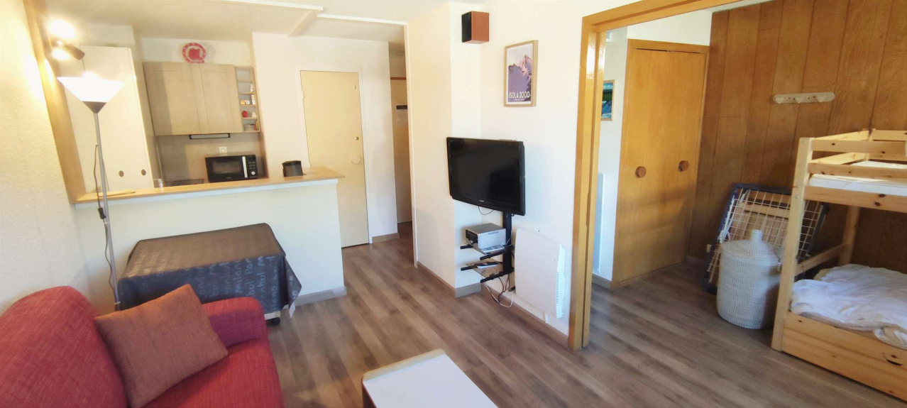 Appartamento F2 di 35 m², situato in un edificio a chalet nel cuore dell'Hameau (lato sud della stazione) a 15 minuti a piedi dal centro. Con una bella vista sul centro dell'Hameau e le montagne, ha un soggiorno che può essere diviso in due da una porta scorrevole per la notte. Bagno e WC separato. Pavimento in parquet. Bei servizi.