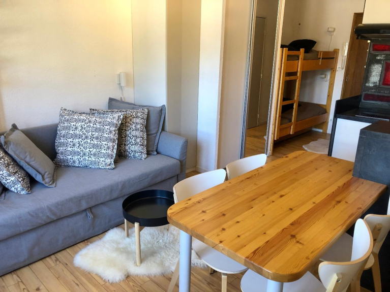 Ingresso, zona montagna con 2 letti a castello, bagno con wc, soggiorno che si apre su un balcone.