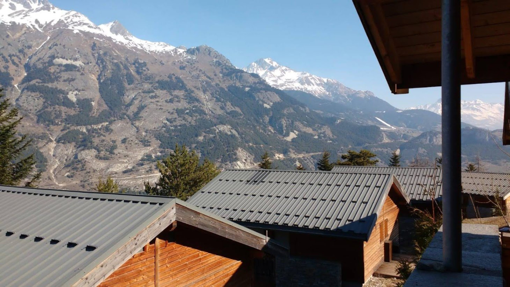 mezzo chalet vicino alle piste. 2 camere da letto in bagno. doccia in bagno. ampio balcone. buon parcheggio. 5 posti letto. con splendida vista sulle montagne.