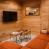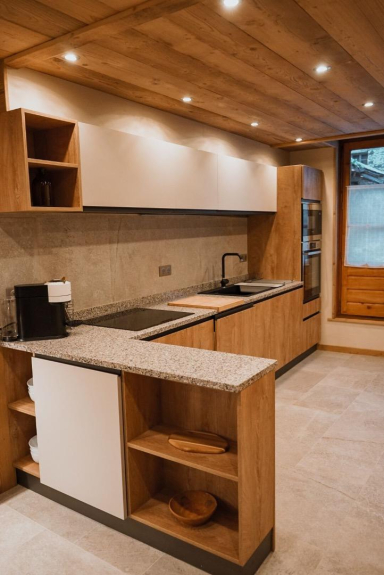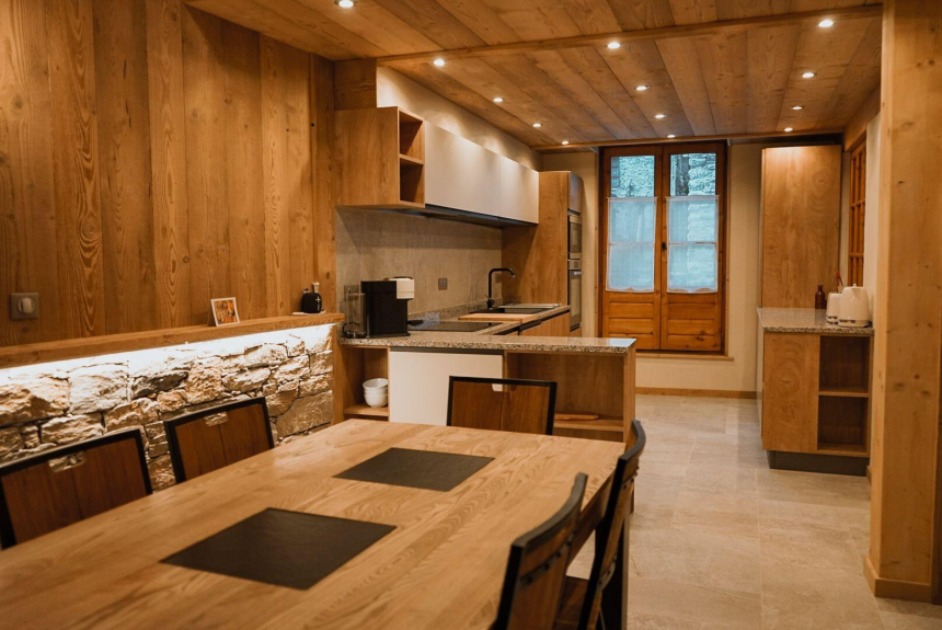 Decorazione calda, legno e pietre antiche, attrezzature di qualità.
