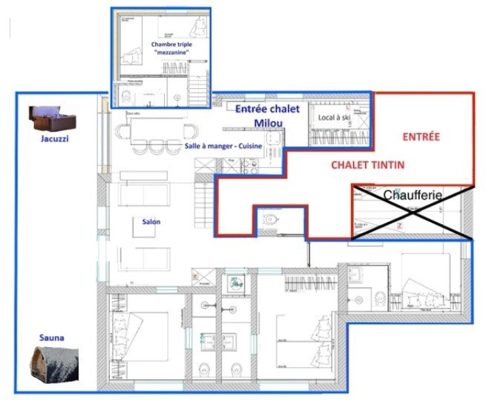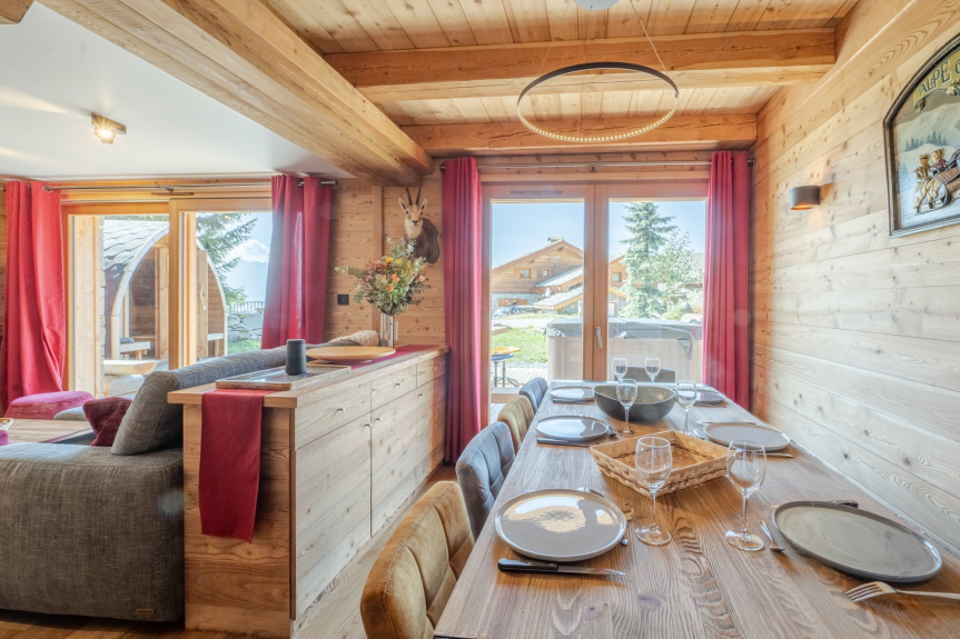 È composto da un soggiorno con cucina completamente attrezzata (forno, piano cottura a gas a 4 fuochi, frigorifero, lavastoviglie, forno a microonde, tostapane, macchina del caffè e bollitore elettrici, macchina L'Or Nespresso, cantina e macchina per raclette) che si apre sulla sala da pranzo, 4 camere da letto (2 camere con 1 letto matrimoniale ciascuna, 1 camera con 2 letti singoli e 1 camera con 3 letti singoli, due dei quali a castello), ognuna con bagno privato con doccia (doccia, mobiletto e WC), deposito sci/bici, sauna e vasca idromassaggio sulla terrazza in stile scandinavo.