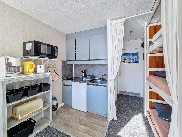 Monolocale di 20m² per 3 persone situato al 13° piano con ascensore, ha un balcone esposto a sud. Ingresso n°1