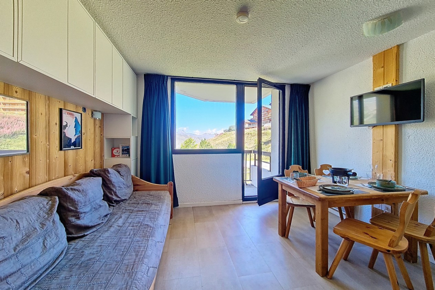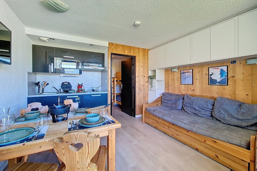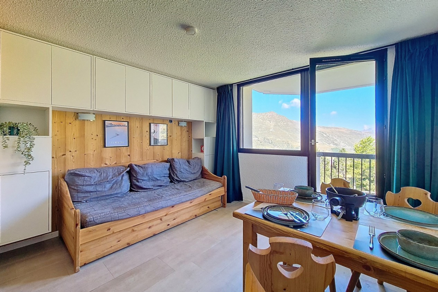 Studio con angolo di montagna di 18 m² per 3 persone. Si trova al terzo piano con ascensore e ha un balcone esposto a nord-ovest.