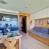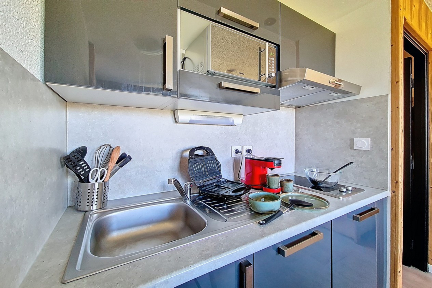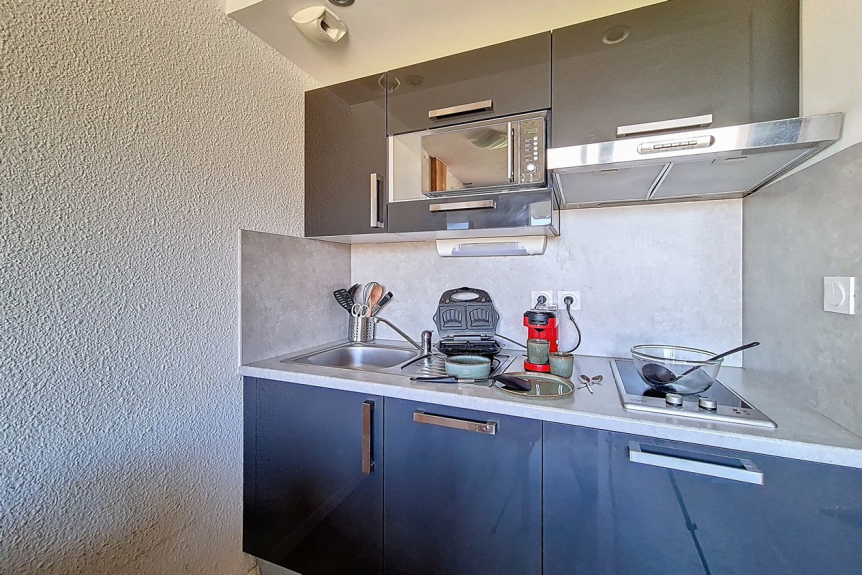 Cucina a incasso con 2 piastre, frigorifero, microonde, lavastoviglie, tostapane, macchina da caffè Senseo e bollitore.