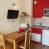 Cucina in muratura con 2 piastre, mini forno, frigorifero, mini lavastoviglie, bollitore, tostapane e macchina da caffè.