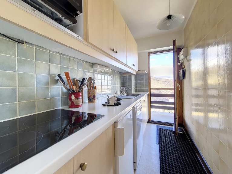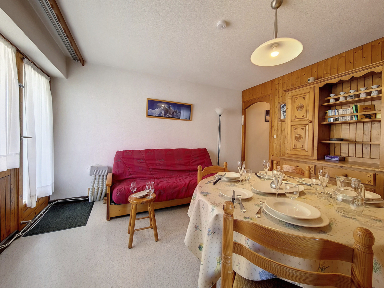 Bellissimo appartamento con 3 stanze di cui 2 camere da letto: 50 m² in totale per 8 persone. Si trova sopra il centro commerciale, nel centro della stazione, al 5° piano di un residence ski in/ski out, vicino agli impianti di risalita e alla partenza delle FSE. L'appartamento ha un balcone esposto a nord-est.