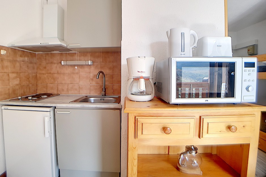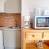 Cucina attrezzata con 2 piastre elettriche, frigorifero, microonde, bollitore, macchina da caffè e tostapane.