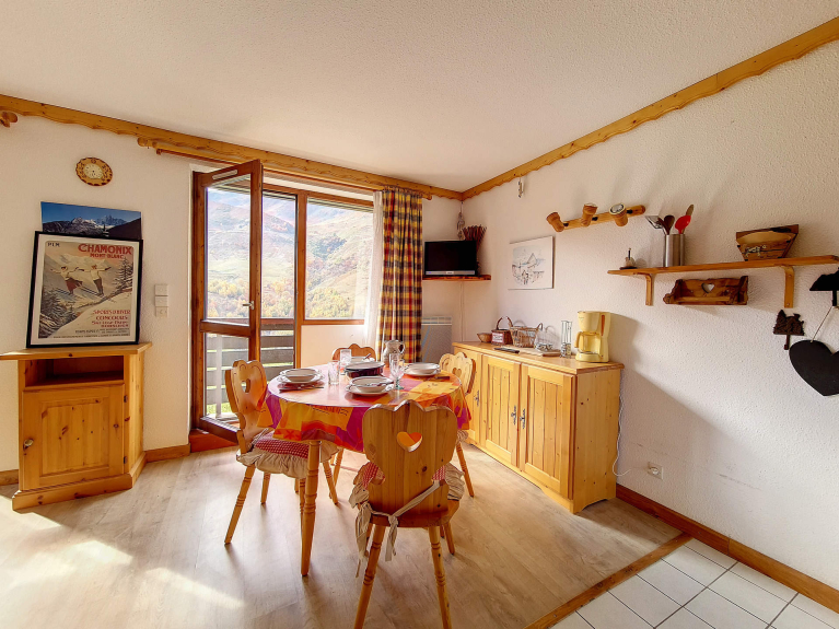 Piacevole studio di 25 m², con 1 cabina per 4 persone. Si trova al piano terra e ha un balcone rivolto a ovest. È possibile sciare dentro e fuori dal balcone.