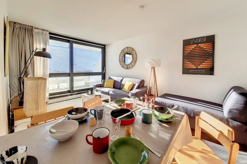 Situato al 14° piano, l'appartamento offre una bella vista panoramica sul resort, il massiccio delle Masse e le Cime Caron.