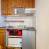 Cucina in muratura con 2 piastre, forno, frigorifero, lavastoviglie e microonde, tostapane, macchina da caffè e bollitore.