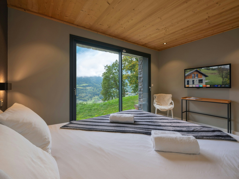 Questo chalet di nuova concezione è stato accuratamente rifinito con l'uso di legno e pietra. Tutte le camere sono dotate di TV, tapparelle e biancheria da letto di alta qualità.