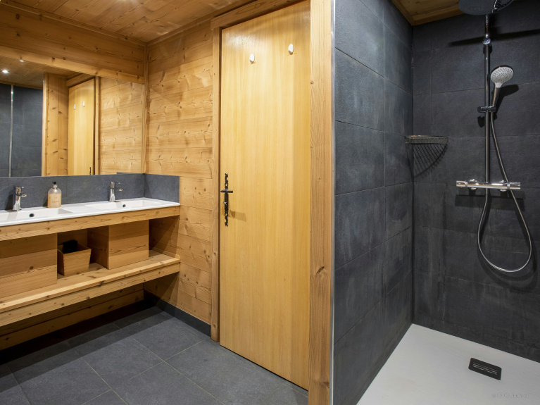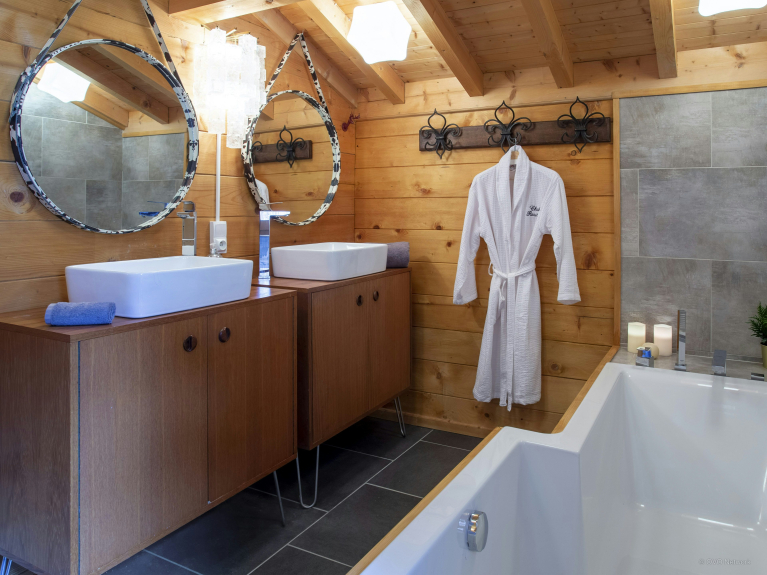 Lo chalet dispone di tre bagni, ma solo una camera da letto ha il bagno in camera. Uno dei bagni è un'estensione del soggiorno e si apre sulla terrazza con vasca idromassaggio. È un luogo molto comodo per sciacquarsi prima di entrare nella vasca idromassaggio.