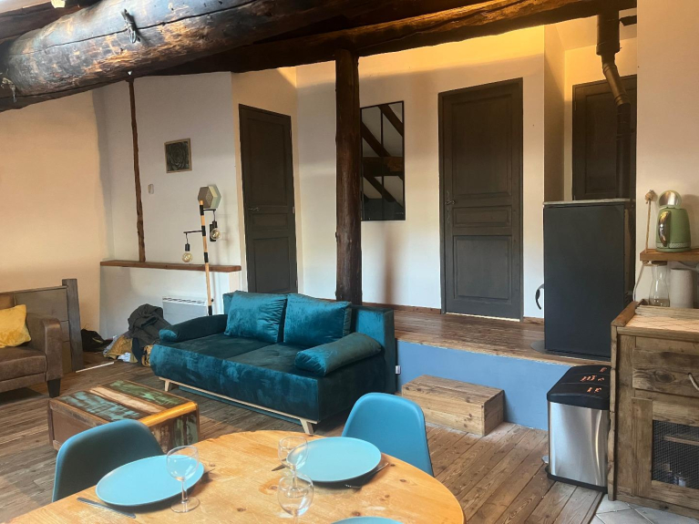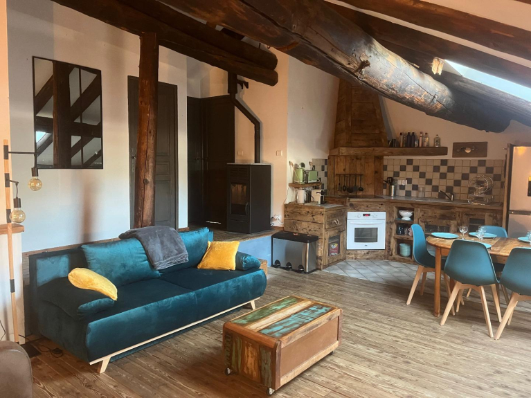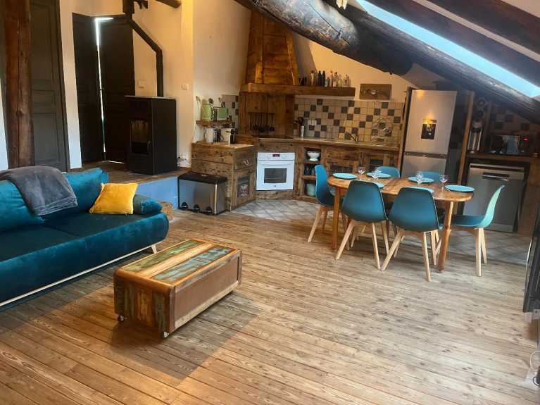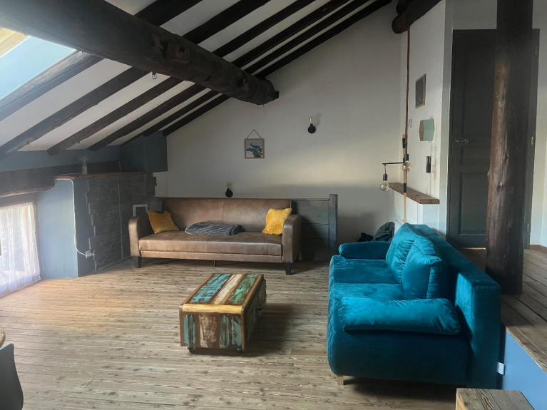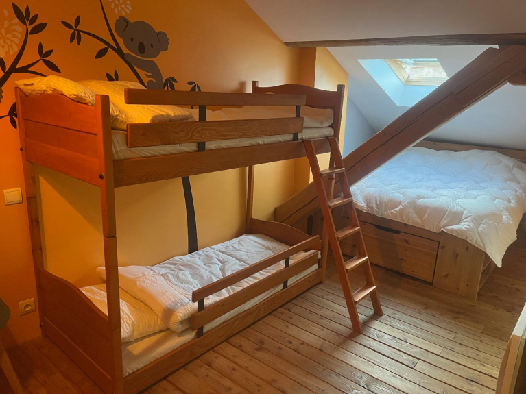 Per 6 persone, ha una superficie di 75 m2 ed è composta da 2 camere da letto (una con letto da 160 cm e l'altra con 2 letti a castello e un letto da 140 cm), un bagno e servizi igienici separati. Una cucina aperta e un ampio soggiorno con 2 divani letto completano questo appartamento. Nell'ingresso c'è un armadietto per gli sci per riporre tutta l'attrezzatura.