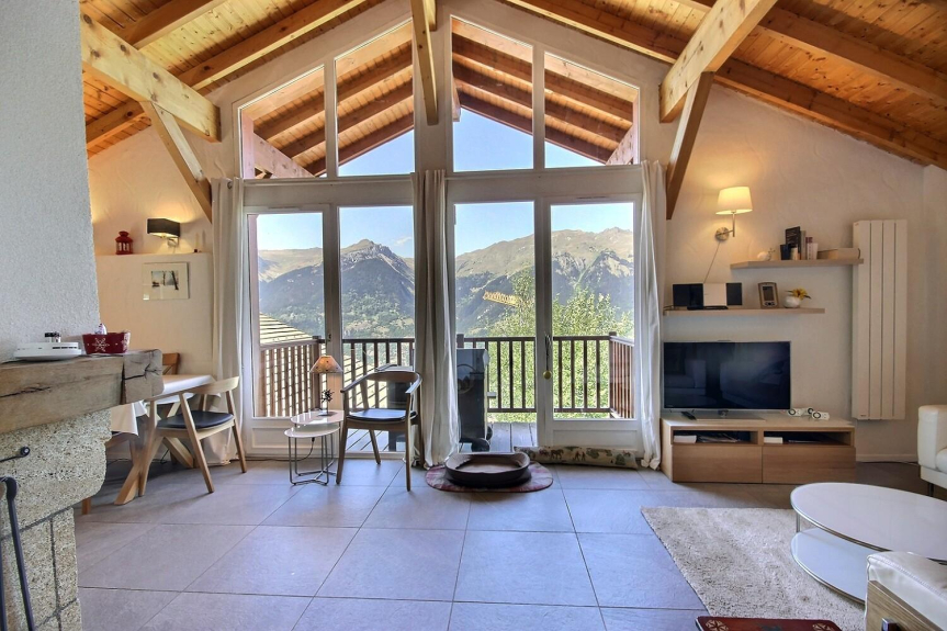 Al livello 2: soggiorno con camino e cucina aperta con macchina per fonduta, macchina per raclette, bollitore, macchina da caffè Nespresso, forno, tostapane, lavastoviglie, microonde, frullatore, piano cottura a induzione, frigorifero. Zona giorno con TV e divano.
