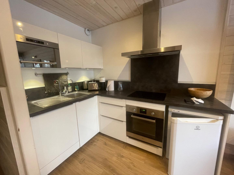 Forno, piano cottura a induzione, microonde, frigorifero, lavastoviglie, tostapane, macchina da caffè Nespresso Vertuo, bollitore, macchina per raclette.