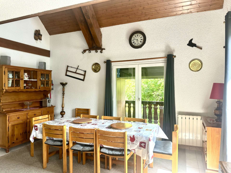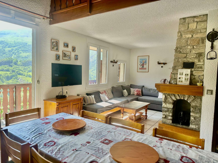 Soggiorno con camino (legna fornita), 1 divano letto 140, televisione, DVD.