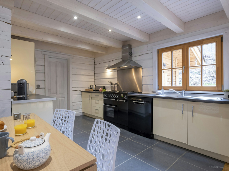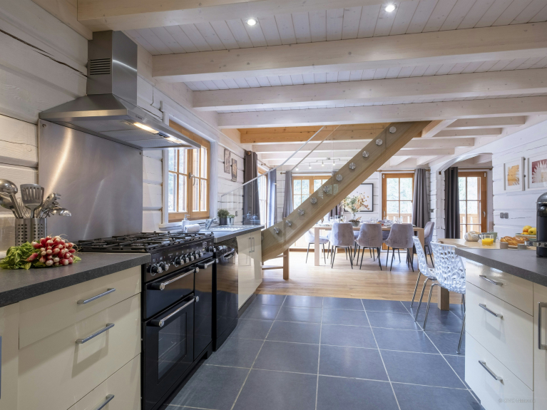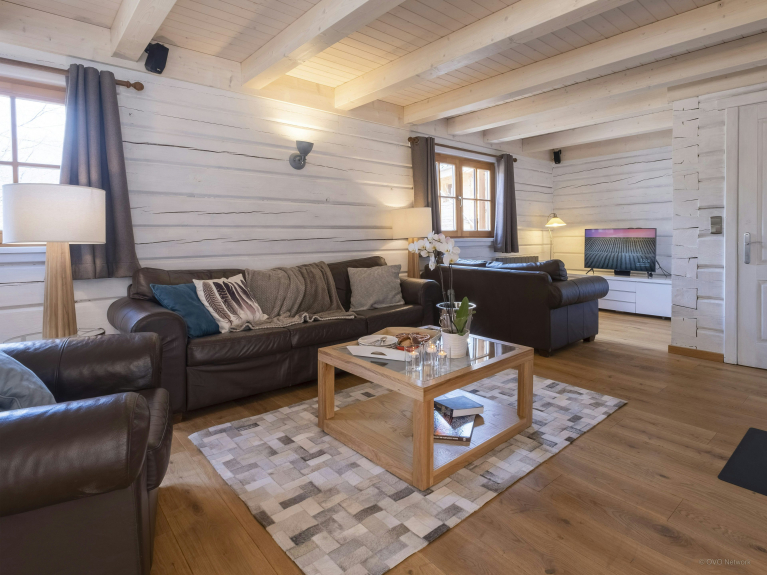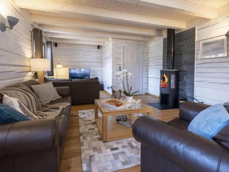 La zona giorno open space offre molto spazio intorno alla stufa a legna, davanti alla Smart TV e intorno al tavolo da pranzo. Prima di cena, potete sorseggiare un aperitivo sulla terrazza o godervi i meravigliosi dintorni dalla vasca idromassaggio all'aperto.