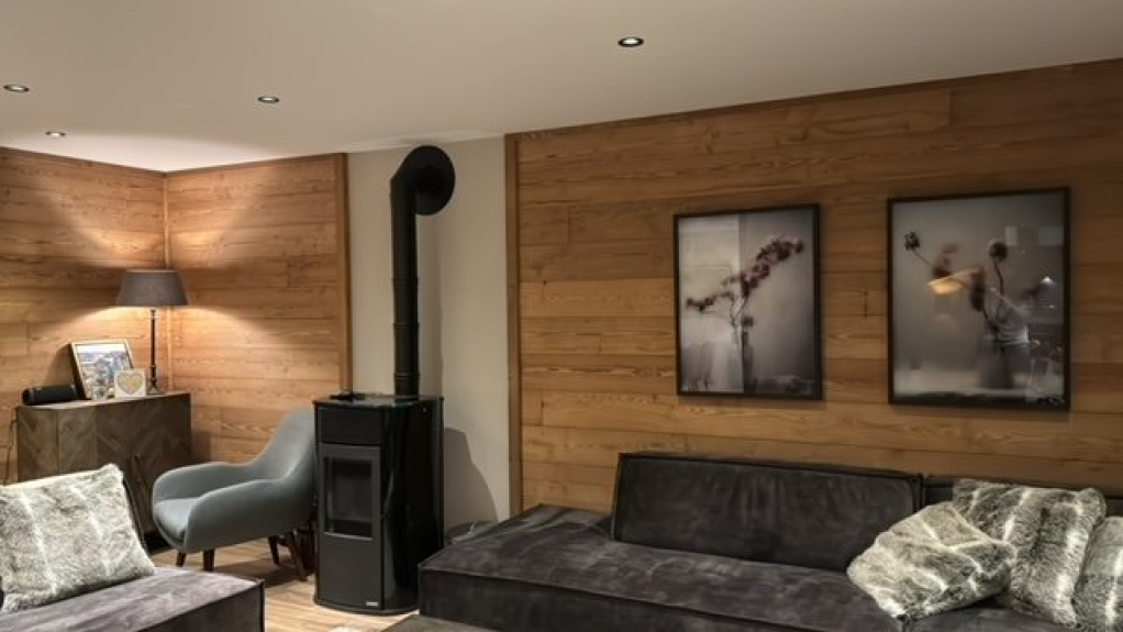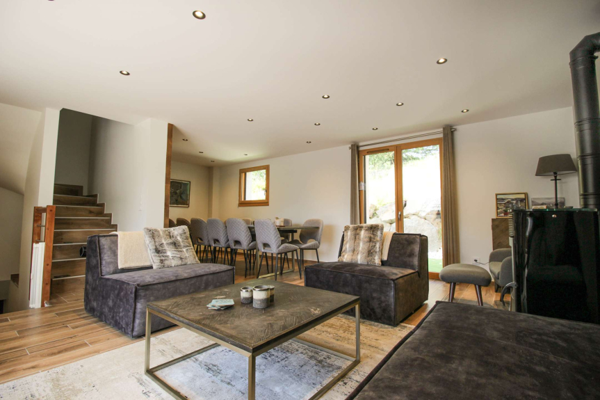 Un ampio soggiorno con zona salotto, stufa a pellet, zona pranzo e cucina completamente attrezzata: frigorifero/congelatore, lavastoviglie, piano cottura a induzione, forno e microonde.