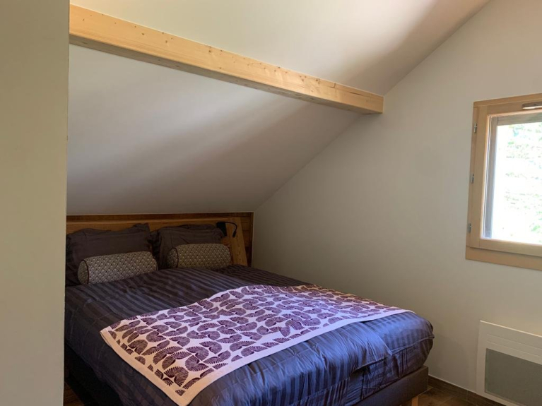 una grande camera da letto mansardata con letto matrimoniale da 160 cm e due divani letto da 70 cm, ideale per i bambini.