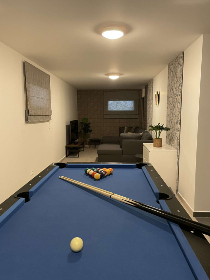 Un'ampia sala giochi con ping pong e tavolo da biliardo.