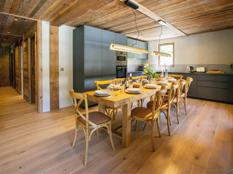 Il magnifico soggiorno dello Chalet Doujet è particolarmente accogliente, con il suo comodo divano ad angolo e il grande tavolo da pranzo. Ci sono tre camere matrimoniali, due delle quali con balcone privato, e un dormitorio per quattro persone che piacerà ai bambini.