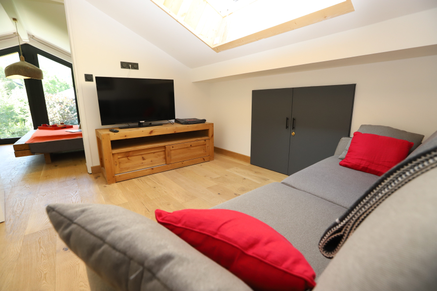 Al centro, un salotto con divano letto (160 cm) e TV, 1 WC separato