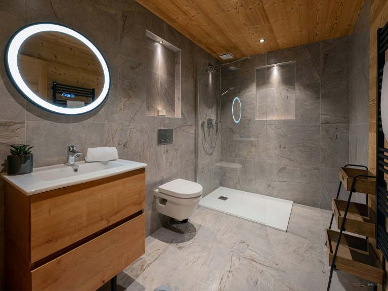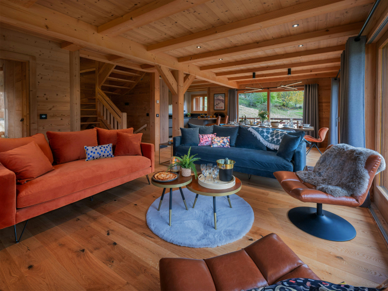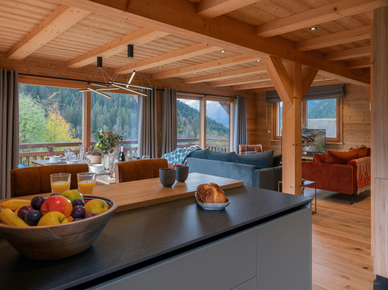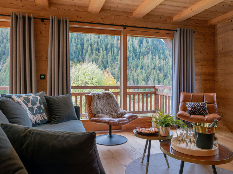 Apprezziamo particolarmente l'arredamento meticoloso dello Chalet Q. I toni blu e naturali si ritrovano in tutta la struttura e le decorazioni alle pareti completano la vostra vacanza in montagna immergendovi in un mondo tipicamente alpino.