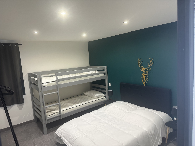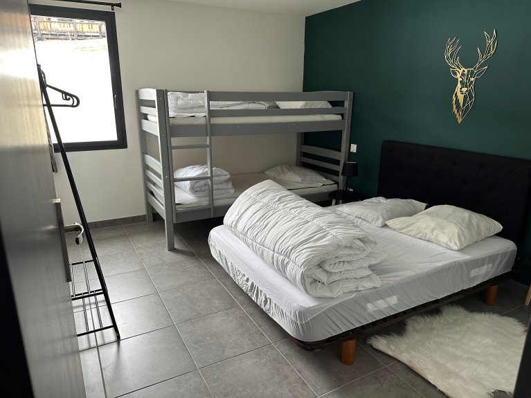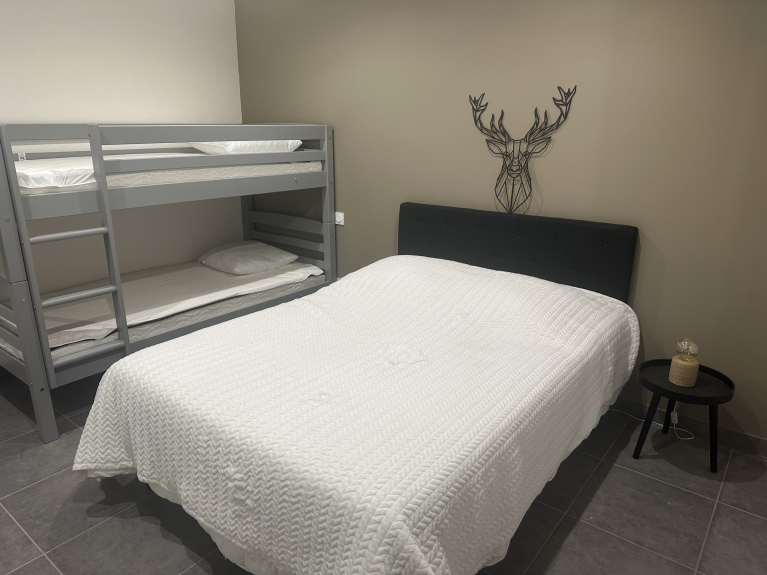 Le nostre due bellissime camere da letto dispongono ciascuna di un letto matrimoniale (140 cm) e di un letto a castello (90 cm).