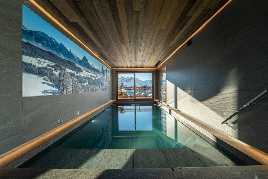 Servizi eccezionali, tra cui area benessere completa con piscina interna riscaldata, getti massaggianti e vista montagna, Hammam, sauna e doccia con vari getti.