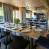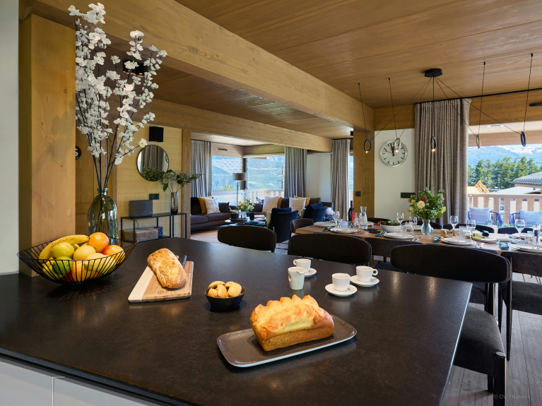 Al primo piano, l'ampia zona giorno è particolarmente luminosa, grazie alle grandi finestre a golfo e alla porta-finestra che si apre sulla terrazza panoramica. L'arredamento in stile scandinavo offre un'atmosfera rilassante e ci si può riunire intorno al camino sospeso o al tavolo da pranzo. La cucina è completamente attrezzata, con un bancone centrale e sgabelli.