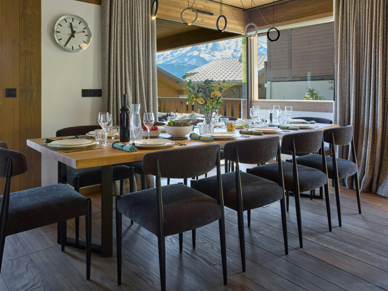 La spaziosa terrazza è dotata di una zona salotto riparata, di un secondo tavolo da pranzo e di una vasca nordica, una sorta di jacuzzi senza bolle. È il luogo perfetto per ammirare la carismatica silhouette del massiccio del Monte Bianco.