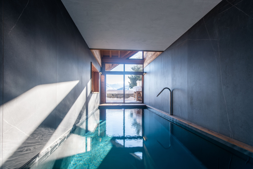 Piscina interna riscaldata, area TV con videoproiettore
