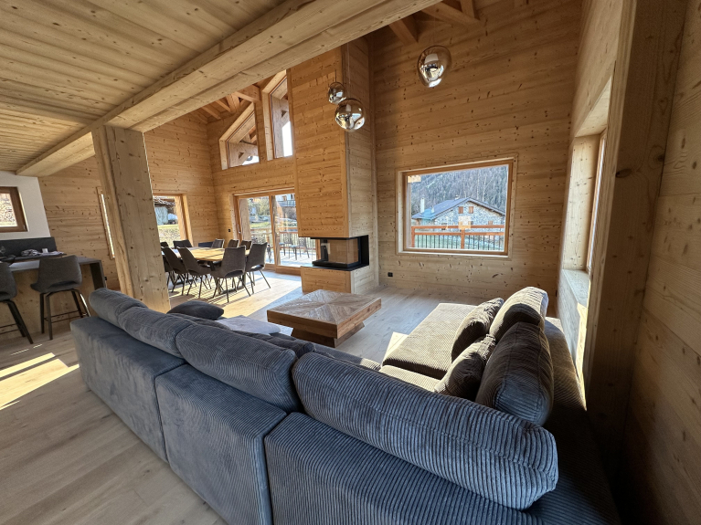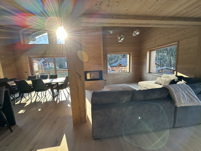 Ampio soggiorno con splendida vista sulla parete nord di Bellecote, camino.
