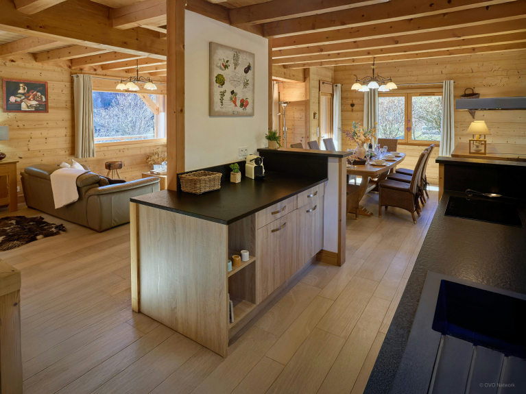 C'è un deposito sci con asciugascarponi riscaldato per liberarsi dell'attrezzatura outdoor. Poi tornate al comfort della sauna o del salone, che contiene due divani, una TV, una stufa a legna e un tavolo da pranzo. La cucina a pianta aperta è dotata di tutto il necessario, compresi un piano cottura a induzione, due macchine da caffè e una lavastoviglie. Due porte-finestre lasciano entrare molta luce e si aprono su un giardino con un secondo tavolo da pranzo.