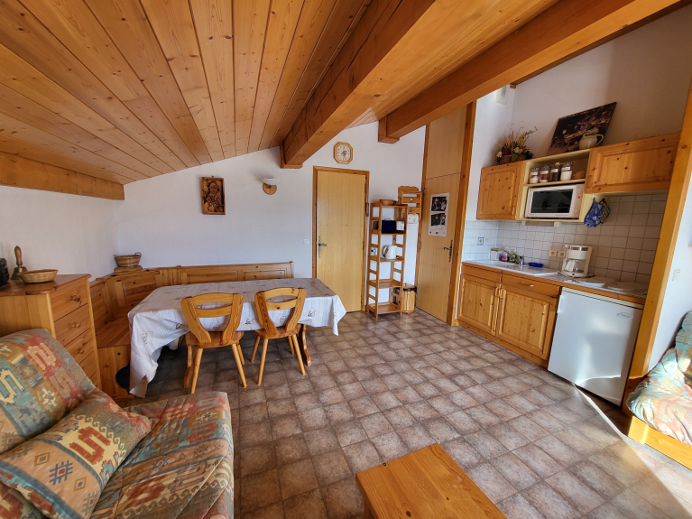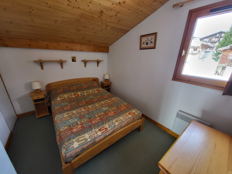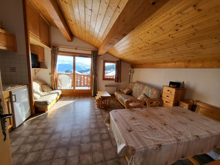 Situato all'ultimo piano, è composto da 2 camere da letto doppie + soggiorno/cucina con 2 divani letto + balcone di 8 m2 esposto a sud con splendida vista sulle montagne Pierra Menta e Beaufortain. Bagno e WC separati. Parcheggio privato all'aperto gratuito + armadietto privato per gli sci.