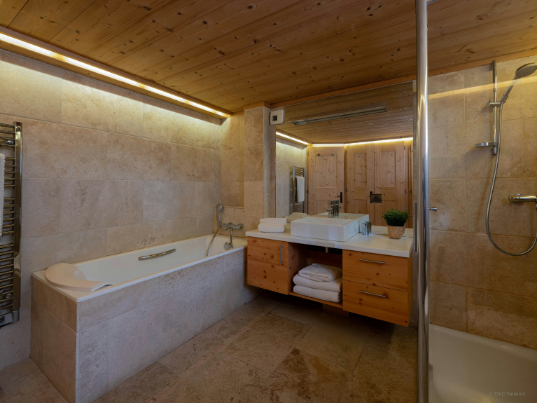 Le tre camere da letto (due matrimoniali e due doppie, tutte con TV) e i bagni si trovano al piano inferiore, insieme a un hammam che offre veri momenti di relax dopo un'intensa giornata in montagna.