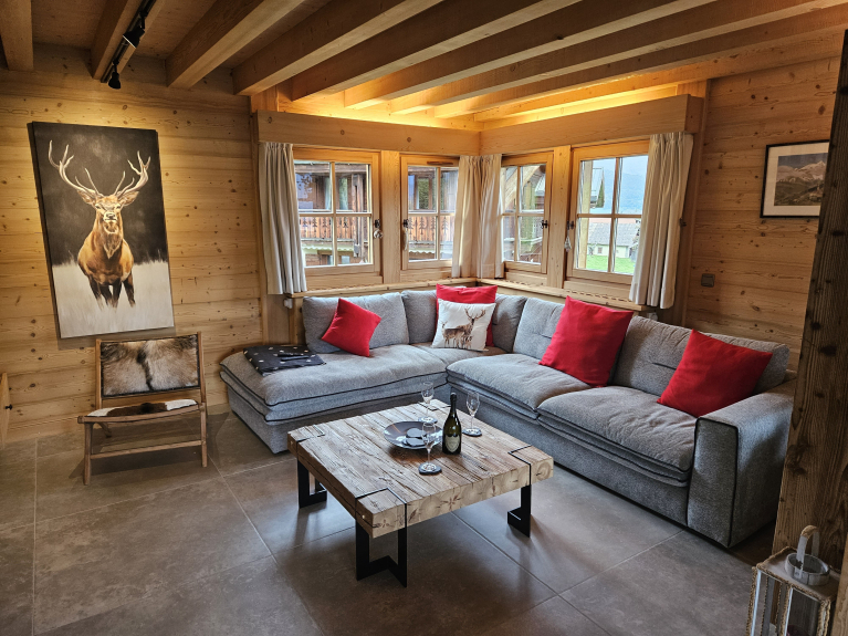 - Un ampio soggiorno (50 m2), aperto e luminoso (finestre a golfo), tavolo da pranzo per 10 persone, un'accogliente zona salotto con camino e divano nu, una TV Live box 6 con canali Canal (ricezione in fibra). Questa stanza ha accesso al giardino e a una terrazza con zona pranzo: tavolo esterno e panche di fronte al Monte Bianco.