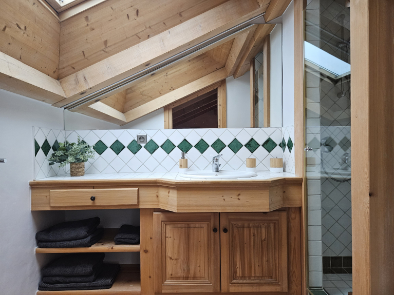 Al piano inferiore: una camera da letto con bagno privato, un letto matrimoniale con materasso nu di alta gamma (160 x 200), un'area salotto con un divano letto molto comodo (160), uno spazio per riporre le cose, una scrivania a schermo piatto, una TV arancione e canali Canal +, un bagno con doccia / WC e accesso diretto al giardino con terrazza con vista sul Monte Bianco.