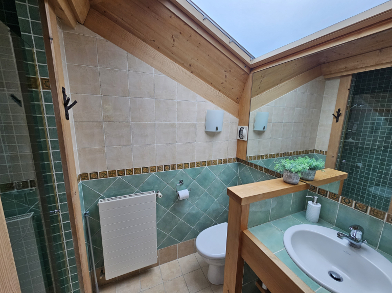 Le altre due camere da letto al piano superiore hanno ciascuna un letto nu di alta gamma (160 x 200), spazio per riporre e armadi, e ciascuna ha il proprio bagno (doccia/WC) con finestra velux.