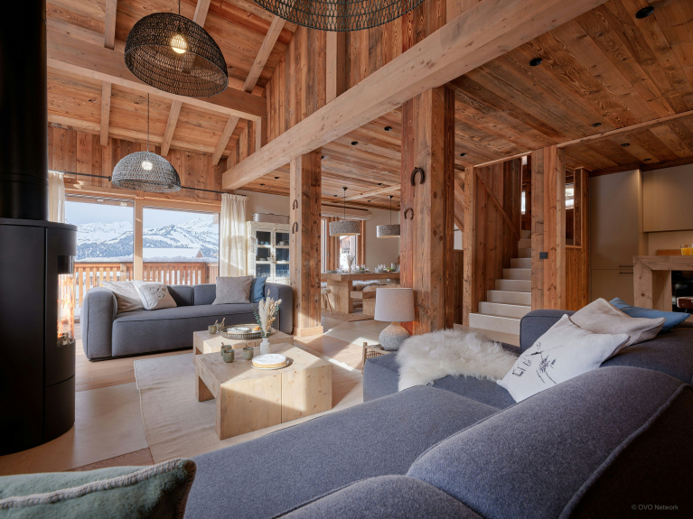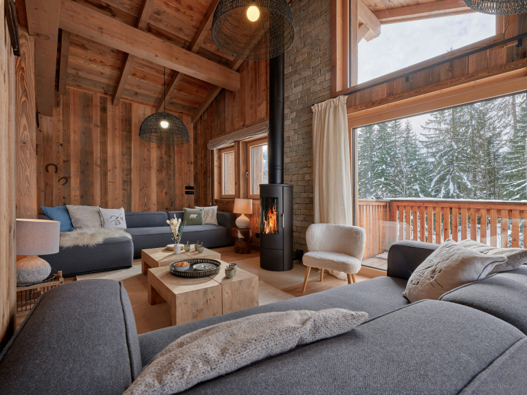 La zona giorno al primo piano è inondata di luce grazie alle alte finestre a golfo e alle porte-finestre che si aprono su un delizioso balcone ad angolo. Da qui, la vista sul Mont Charvin e sulle montagne degli Aravis è assolutamente sensazionale. Due grandi divani vi permetteranno di riunirvi intorno alla stufa a legna per raccontare le avventure della giornata. Qui non troverete la televisione, perché lo Chalet Marmot'Inn è all'insegna della convivialità.