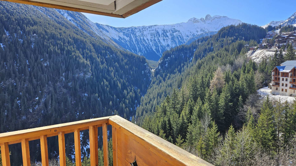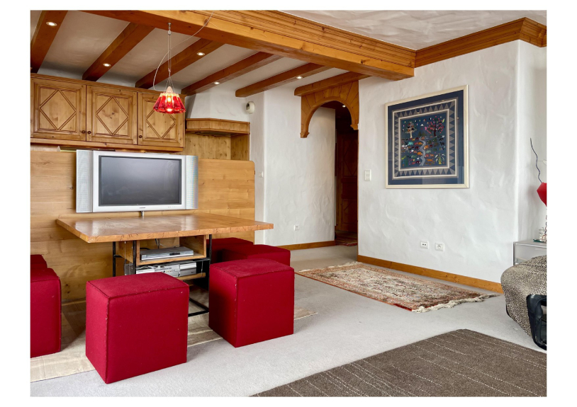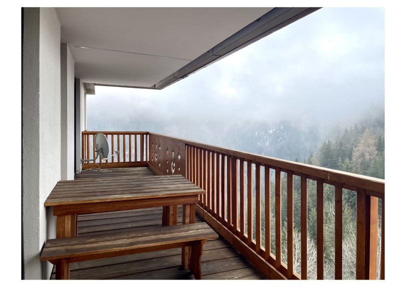 Soggiorno con zona pranzo e balcone esposto a nord-est con vista sulle montagne (Dent du Villard).