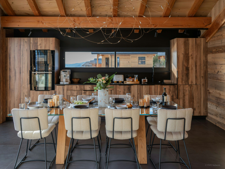 La cucina completamente attrezzata comprende un piano cottura a induzione, una lavastoviglie, un microonde e un robot da cucina multifunzione. Tutti possono riunirsi intorno all'elegante tavolo da pranzo in vetro o, con il bel tempo, sulla spaziosa terrazza arredata.