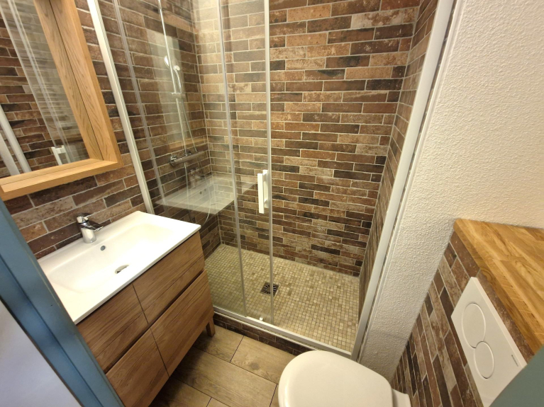 - 1 bagno con doccia, lavabo e scaldasalviette.