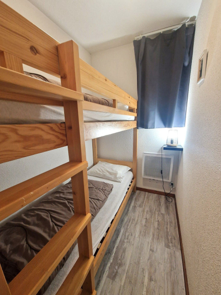 - 2 letti a castello in una cameretta, porta e finestra.